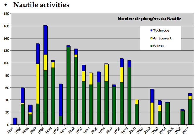 法國(guó)1984年研制成的“鸚鵡螺”號(hào)潛水器最大下潛深度可達(dá)6000米,活動(dòng)范圍可以遍及全球海域的97%。累計(jì)下潛了1700多次,完成過(guò)多金屬結(jié)合區(qū)域,深海海底生態(tài)等調(diào)查,以及沉船、有害廢料等搜索任務(wù)。該深潛器的操作和維護(hù)由GENAVIR進(jìn)行,Ifremer負(fù)責(zé)Nautile的技術(shù)支持和改進(jìn)。載人球體的材料為鈦合金,深潛器前面裝有兩個(gè)機(jī)器手臂,可用于采集樣品。Nautile的工作小組至少有8個(gè)人,包括2個(gè)潛航員(其中一個(gè)可作為監(jiān)督者)、2個(gè)精通電子的潛航員、2個(gè)導(dǎo)航專家、2個(gè)精通于機(jī)械的潛航員。“鸚鵡螺”號(hào)于19871998年期間,共打撈文物1500多件,它用兩個(gè)機(jī)器手臂將文物放在箱子里,然后帶回水面。1998年,“鸚鵡螺”號(hào)將一個(gè)很大(長(zhǎng)8米,寬7米)的船殼的碎片帶回水面。它的機(jī)器手臂非常靈活,即使是遇到一個(gè)水晶花瓶,也能夠完好無(wú)損地被帶回水面。
