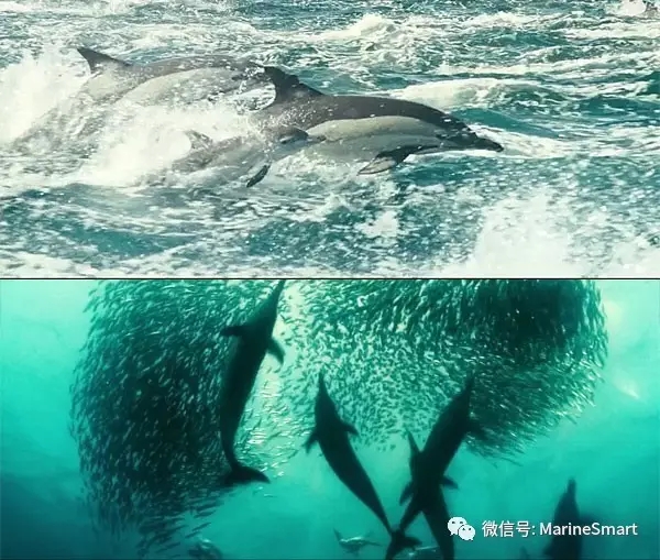 ▲在《海洋》中,長吻真海豚相互合作驅逐沙丁魚群,將魚群分割為一個個“餌球”。