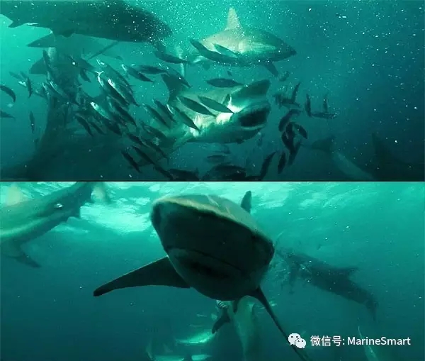 但是這么巨大的一塊誘餌堂而皇之地路過,各方豪強豈有不取的道理?讓我們把鏡頭拉近,看一看捕食者們在沙丁魚遷徙途中的饕餮盛宴吧。