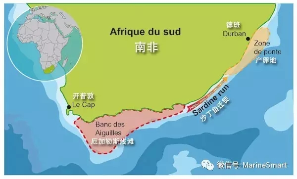 厄加勒斯角(Cape Agulhas)是非洲大陸的最南端,被國際海道測量組織定義為印度洋和大西洋的分界點。每年5月到7月間,大波的(總數可以數十億計)南非擬沙丁魚就從厄加勒斯淺灘(Agulhas Bank)出發,沿著南非東岸向北遷徙,目的地是德班——南非第三大城市,位于夸祖魯-納塔爾省(KwaZulu-Natal)——北部的海域,路線長度超過1,000公里。