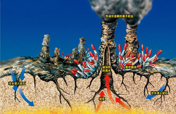 海底熱液活動在離散板塊邊界和匯聚板塊邊界均可出現,但都集中在拉張性構造帶上,主要分布于洋中脊、弧后擴張中心等。其形成的機理是:海水沿裂谷張性斷裂或裂隙滲入洋殼內部,受熾熱的熔巖影響后與基底玄武巖發生反應,形成酸性、還原且富硫化物與成礦金屬的熱液,溫度高達350~400℃。反應程度隨溫度和壓力的增加而增加,直到巖石變得難以滲透,含礦熱液就上升回到海底。當它們從噴口涌出時與冷海水相遇,導致黃鐵礦、黃銅礦、纖鋅礦、閃鋅礦等硫化物及鈣、鎂硫酸鹽的快速沉淀,最后不斷堆積成一種煙囪狀的地貌。煙囪高低粗細各不相同,高的可以達到一百多米,矮的也有幾米到幾十米。因溫度和組分差異,形成白煙囪或黑煙囪:當熱液溫度為100~350℃時,形成主要由硫酸鹽礦物(硬石膏、重晶石)、二氧化硅和白鐵礦組成的白煙囪。當溫度≥350℃時,形成由暗色硫化物如磁黃鐵礦、閃鋅礦和黃銅礦等堆積而成的黑煙囪。