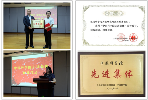 會前他們首先參觀了工程實驗室、深海極端環境模擬研究實驗室。上午9時,授牌儀式正式開始,廣州分院副院長魏平致辭,衷心祝賀我所榮獲2016年度“中國科學院先進集體”榮譽稱號。院工會常務副主席霍妍麗宣讀了《人力資源社會保障部 中國科學院關于授予中國科學院深海科學與工程研究所深淵科考團隊和微小衛星創新研究院暗物質粒子探測衛星研制團隊“中國科學院先進集體”榮譽稱號的決定》(人社部發〔2017〕6號)。房自正副書記頒發了獎牌和證書,首席顧問劉心成代表深海所深淵科考團隊接受了榮譽授予。