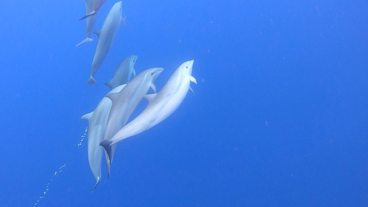 該航次歷時(shí)21天,航程3000多公里,考察區(qū)域集中在南海北部西沙群島和中沙群島的陸坡、海山及海槽水域。航次采用目視考察和被動(dòng)聲學(xué)監(jiān)測(cè)相結(jié)合的方法,并輔以環(huán)境DNA收集,旨在“2019年南海深潛及遠(yuǎn)海鯨類(lèi)科考” 航次的基礎(chǔ)上,進(jìn)一步對(duì)考察海域的鯨類(lèi)物種多樣性、種群現(xiàn)狀及分布模式等進(jìn)行較為全面的調(diào)查。考察期間,共目擊到深潛和遠(yuǎn)海鯨類(lèi)動(dòng)物31群次,其中深潛鯨類(lèi)14群次。通過(guò)視頻和照相拍攝、動(dòng)物水下發(fā)聲記錄,獲取了大量的南海鯨類(lèi)圖片、視頻和音頻等資料。