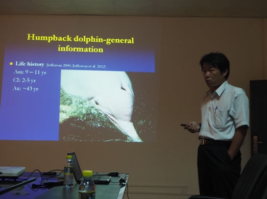 報告中,黃祥麟以臺灣西海岸國光石化廠的興建對附近水域中華白海豚生存狀況的影響為切入點,介紹了以中華白海豚為例的種群滅絕風險評估步驟。隨后,黃祥麟與參會科研人員分享了最近的科研成果,即通過分析衛(wèi)星影像資料的歷史變化,評估臺灣西海岸、福建廈門、廣東珠江口和廣西欽州等中華白海豚重要分布地區(qū)填海的程度,發(fā)現(xiàn)中華白海豚面臨適宜棲息地大范圍喪失的嚴重威脅,并提出相關保育措施。與會人員還就魚類資源衰退對中華白海豚種群數(shù)量的影響、設置海洋自然保護區(qū)的意義和中華白海豚棲息地選擇等問題與黃祥麟進行了深入交流。