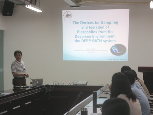 5月20日,日本海洋科學(xué)技術(shù)中心Dr.KATO訪問(wèn)中科院三亞深海科學(xué)與工程研究所(籌),并做了題為“深海環(huán)境中嗜壓微生物的分離培養(yǎng)及采樣設(shè)備介紹”(The Devices for Sampling and Isolation of Piezophiles from the Deep-sea Environment, the DEEP BATH System)的學(xué)術(shù)報(bào)告。