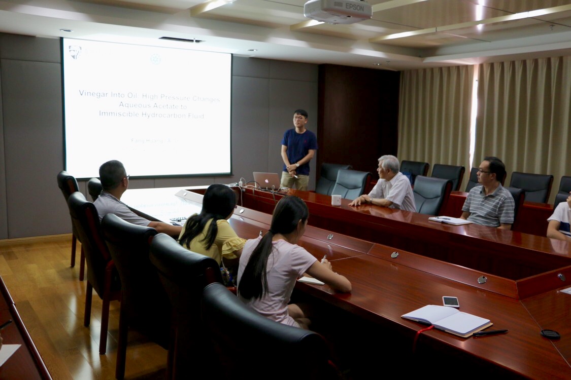7月12日,應深海極端環境模擬研究實驗室周義明研究員的邀請,美國約翰霍普金斯大學地球與行星科學系博士生黃放到所訪問交流,作了題為“Vinegar into Oil: High Pressure Changes Aqueous Acetate to Immiscible Hydrocarbon Fluid”的學術報告。