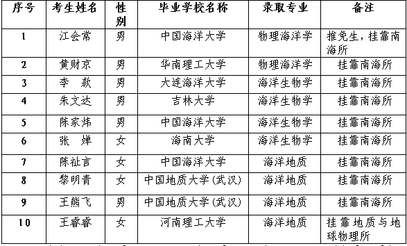 2015年三亞深海所招收攻讀碩士學位研究生通過復試(擬錄?。┟麊喂?/p>