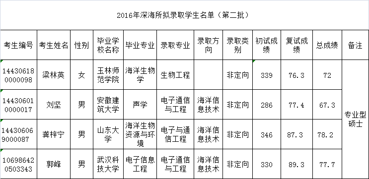 三亞深海所2016年碩士生通過面試擬錄取名單公示(第二批)