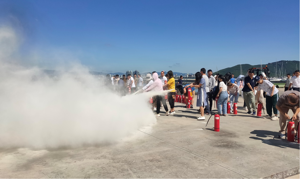 報告會結束后,活動進入消防逃生演習部分,所職工學生模擬消防逃生到達指定地點集合后,專業人員現場講解了干粉滅火器、二氧化碳滅火器和防毒面具的使用方法,并開展了滅火實操演練,加強了大家對于消防設備的理解。