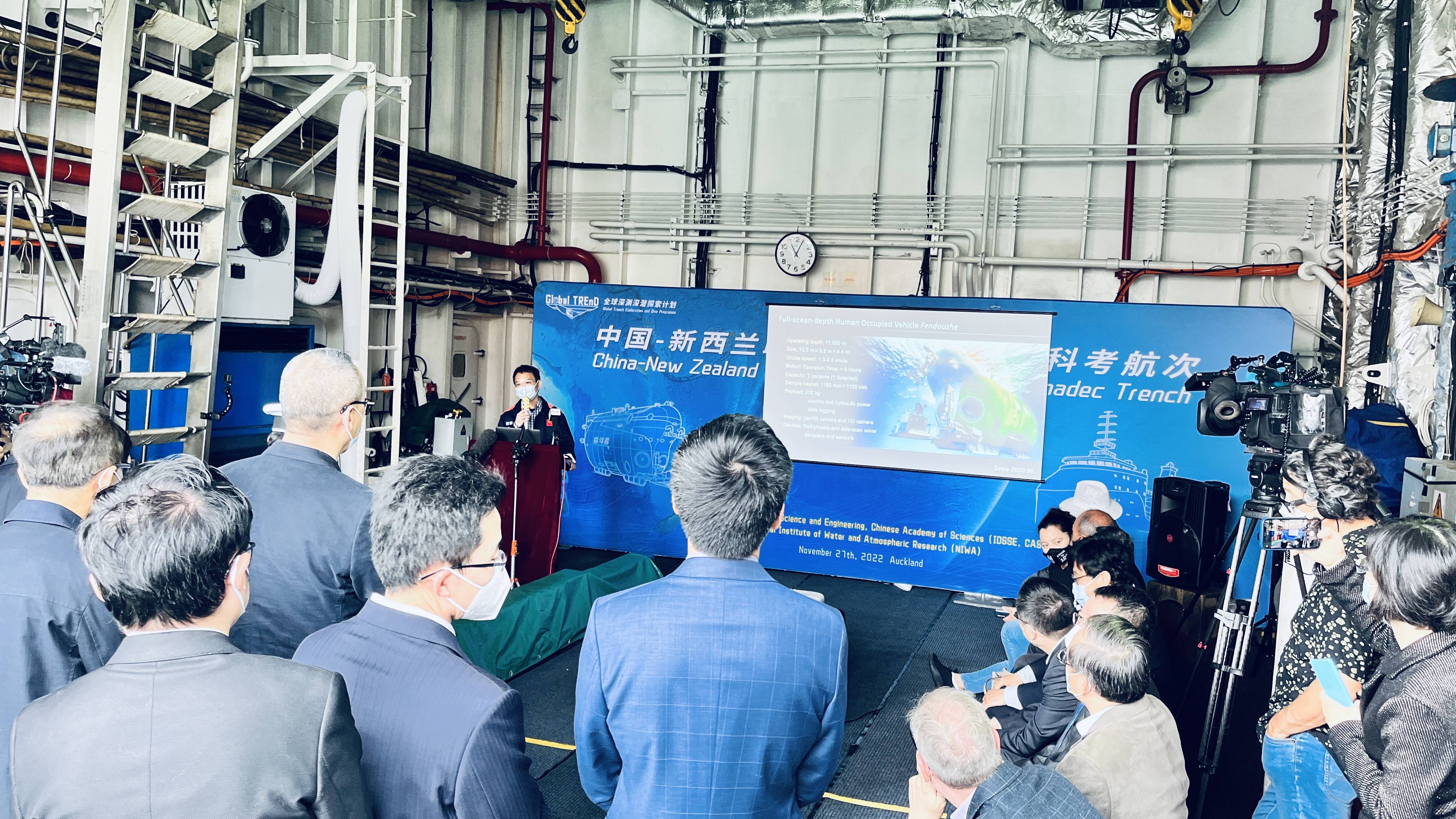 11月27日,中-新聯合深淵深潛科考隊在“探索一號”母船召開航次招待會。航次領隊兼首席科學家彭曉彤研究員介紹航次實施情況和成果。中國駐新西蘭大使王小龍、中科院副院長張亞平、NIWA副首席執行官Rob Murdoch、深海所副所長陽寧、NIWA研究員Ashley Rowden等出席招待會并致辭。出席本次活動的還有中國駐奧克蘭總領事陳世杰、奧克蘭博物館首席執行官David Gaimster以及新西蘭原住民代表、華人科學家、知名僑領和中外媒體等。