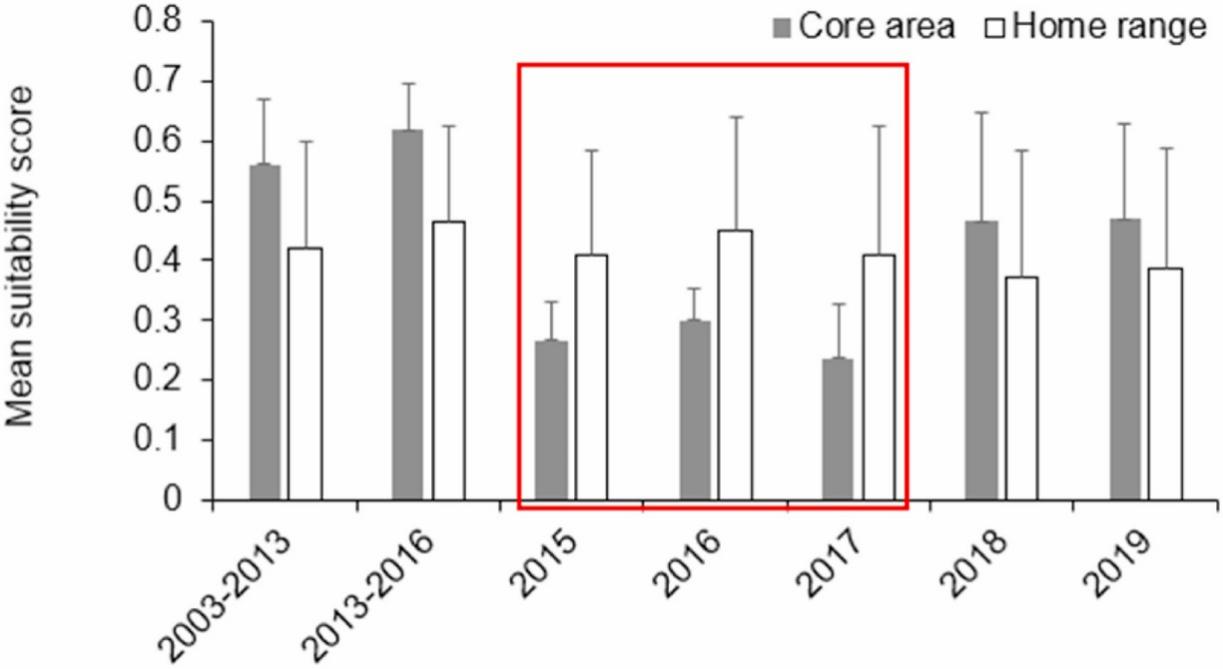 圖3. 中華白海豚種群的平均核心棲息地適合度